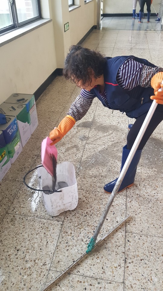 ▶ 기계가 닿지 않는 부분은 수세미/ 헤라 등을 이용해 오염물질을 제거한다.