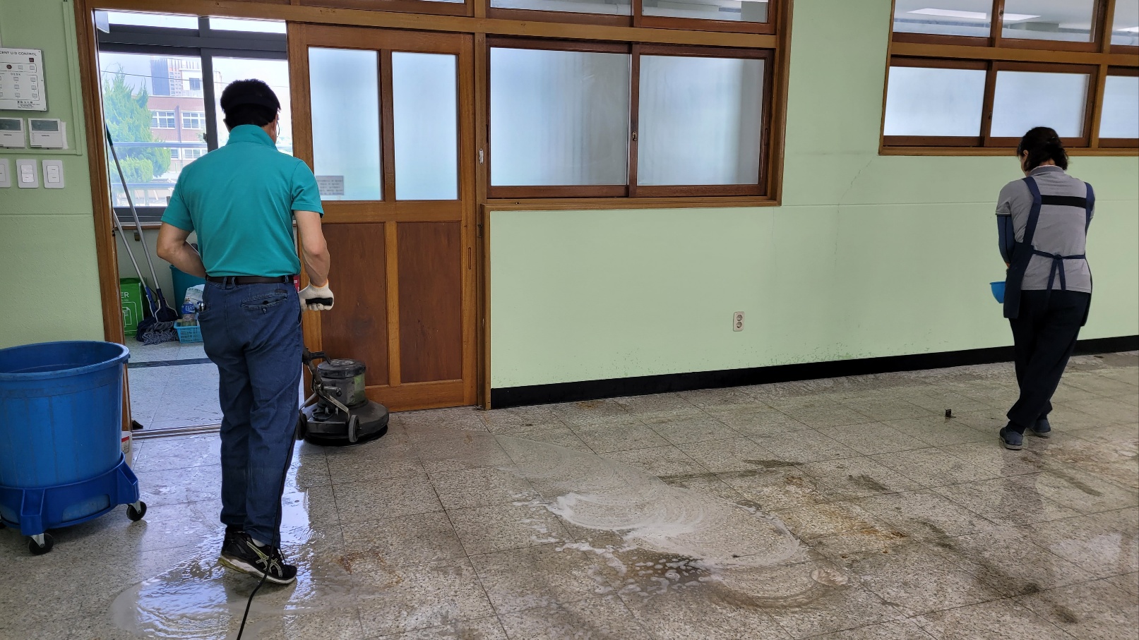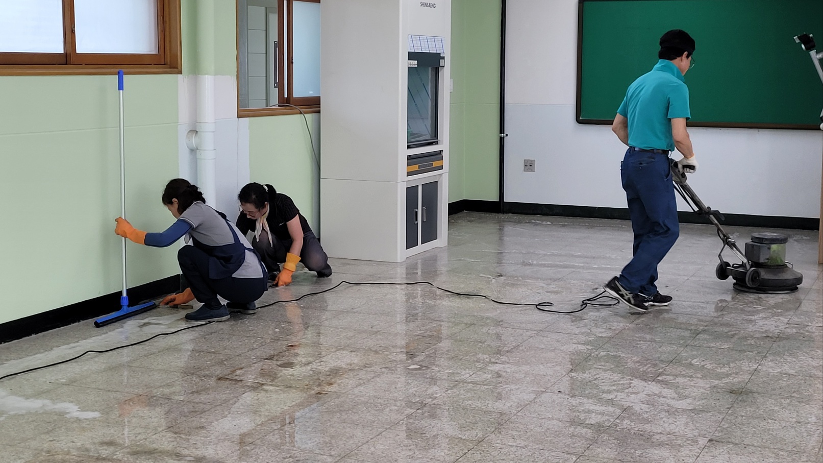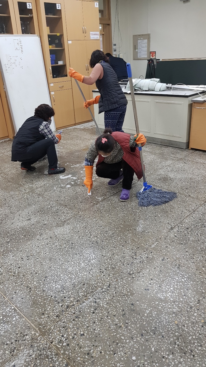 ▶ 바닥면을 깨끗이 쓸고 난 후 바닥재질에 맞는 약품을 골고루 도포한다.